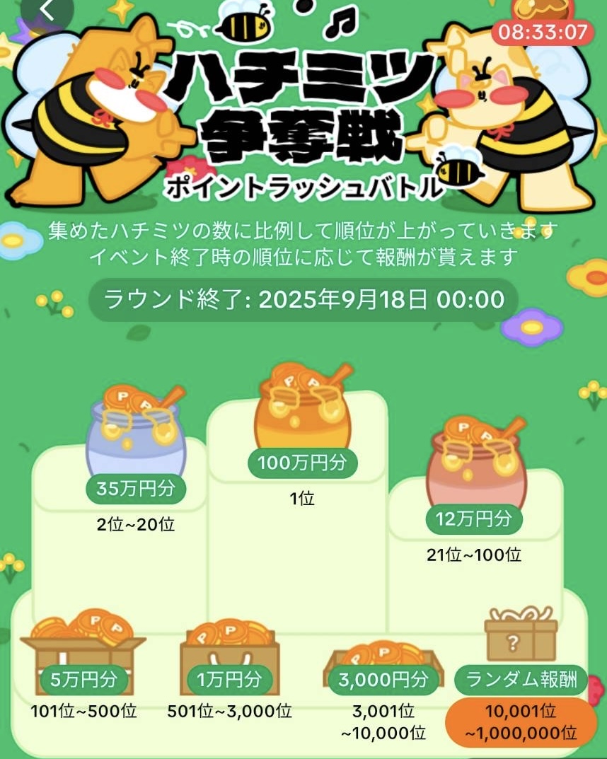 ハチミツ争奪戦イベント終了後、最終順位に基づき上位1000000名のユーザーに順位に応じた報酬が付与されます。