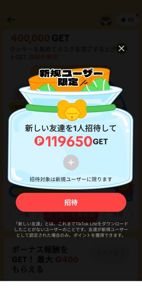- アプリを起動していない友達を招待する:当日にTikTok Liteを起動していないユーザーをTikTok Liteに招待する。