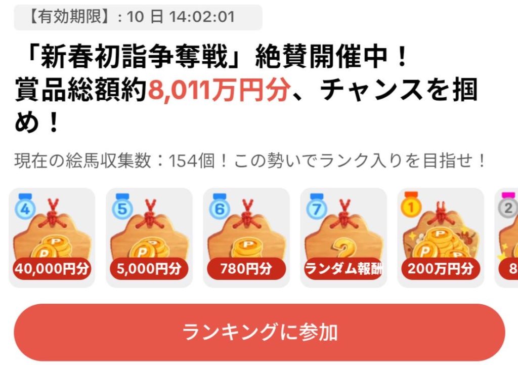 新春初詣争奪戦イベント終了後、最終順位に基づき上位1000000名のユーザーに順位に応じた報酬が付与されます。